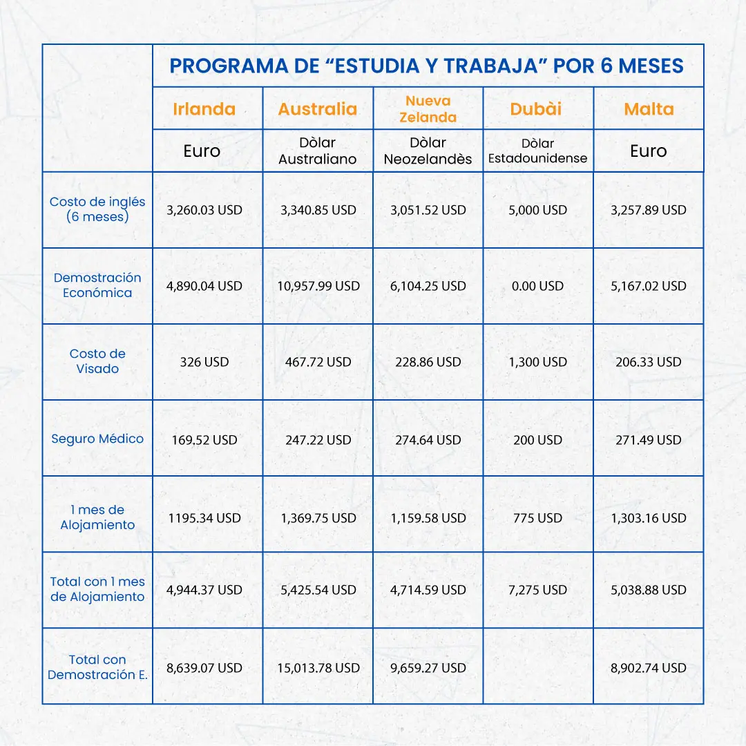 Al elegir un destino para tu programa de "work and study", es importante considerar varios factores, incluyendo la calidad educativa y las oportunidades laborales, pero también el costo de vida y los requisitos de visa. Aquí te presentamos una comparativa de precios entre cinco destinos populares para estudiantes internacionales: Irlanda, Australia, Nueva Zelanda, Dubái y Malta.