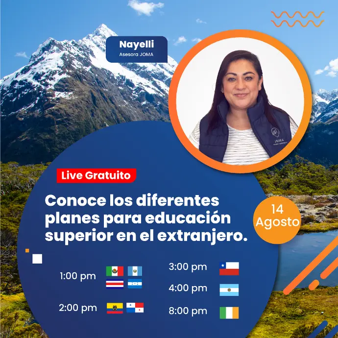 Únete a nuestro LIVE GRATUITO, donde la experta en educación internacional, Nayelli Mier, te ayudará a planificar tu futuro académico fuera de tu país.