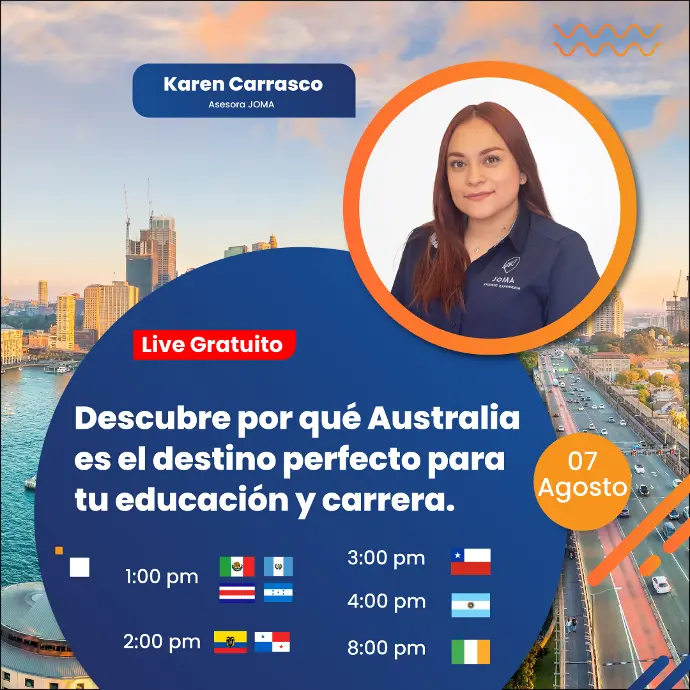 Acompáñanos en nuestro EN VIVO con la experta Karen Carrasco, donde hablaremos sobre todo lo que debes saber antes de embarcarte en tu aventura para estudiar y trabajar en Australia.