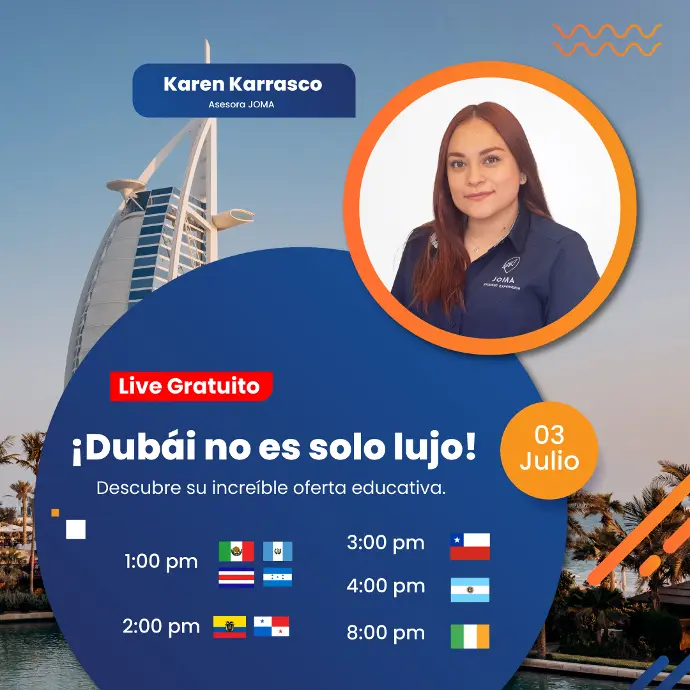 Acompáñanos en nuestro EN VIVO con la experta Karen Carrasco, donde hablaremos sobre todo lo que debes saber antes de embarcarte en tu aventura para estudiar y trabajar en Dubái.