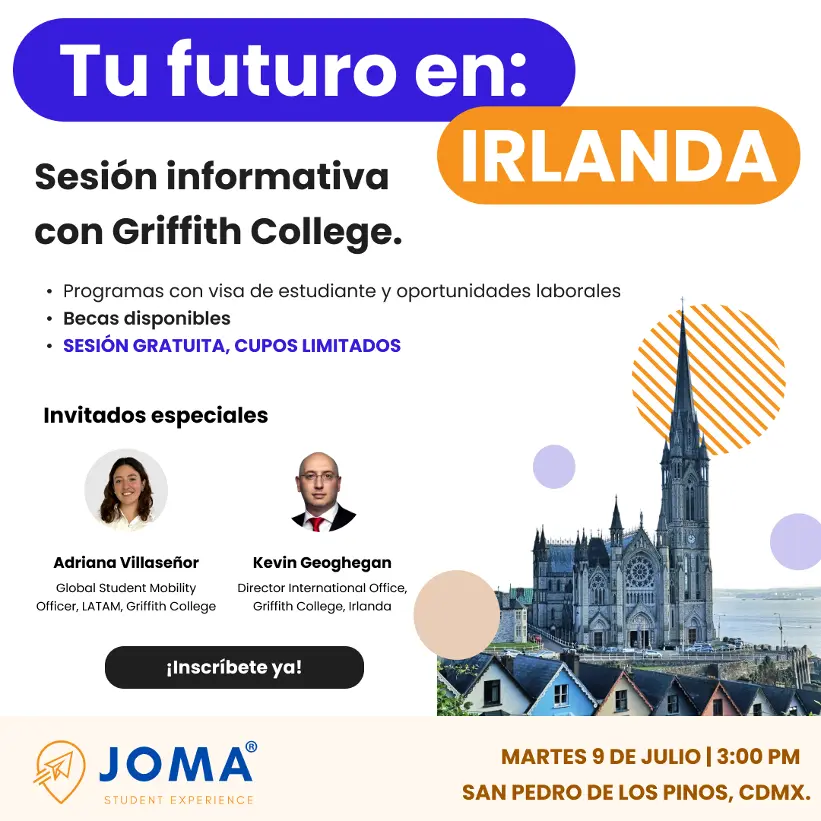 ¡No te pierdas esta oportunidad única de conocer todo sobre estudiar en Irlanda! Te invitamos a nuestra reunión informativa con Griffith College, una institución de renombre internacional con campus en Dublín, Cork y Limerick. Descubre por qué es el destino ideal para estudiantes de todo el mundo.
