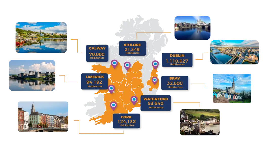 Desde la vibrante Cork hasta la histórica Galway, pasando por la cosmopolita Dublín y la encantadora Limerick